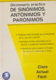 Diccionario práctico diseñado para estudiantes y público en general. Incluye sinónimos, antónimos y parónimos con ejemplos de uso. Por cada 10 membresías que se re utilicen, reforestamos 1 árbol, cumpliendo nuestro desafío de reforestación de más de 10.000 nuevos árboles